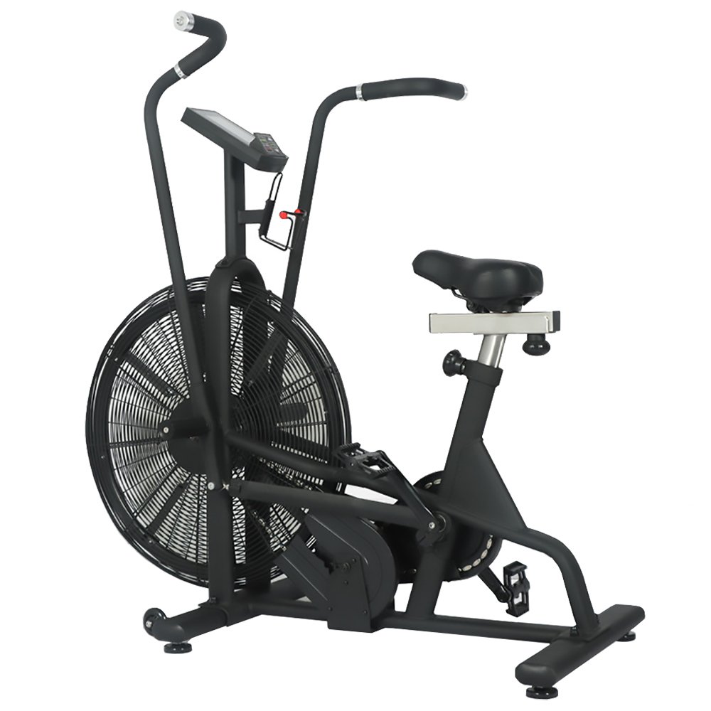 Vzduchové Cyklotrenažéry Air bike si zakládají především na systému odporu tvořeným vzduchem s lopatkovým kolem, které je přes převod spojeno s pedály. Díky tomu je během otáčení ventilátoru vytvářen odpor vzduchu přes lopatky a tím je generován odpor při cvičení, který se plynule zvětšuje se stoupající rychlostí. Zjednodušeně vzato – Velký ventilátor vytváří vzduchový odpor, takže čím rychleji a intenzivněji se opíráte do pedálů, tím větší je celková zátěž. Výhodou tohoto systému je plynulý a přirozený pohyb – zátěž reaguje na to, jestli přidáváte nebo polevujete. Skvěle se tak přizpůsobuje Vašemu tréninku, ať máte jakoukoliv kondici.  Pedály jsou vybaveny speciálním protiskluzovým povrchem, díky kterému se do nich budete moct vždy pevně opřít. Pohyblivá madla rukou jsou spojena s pedály a přináší tím zapojení horní i spodní části těla.