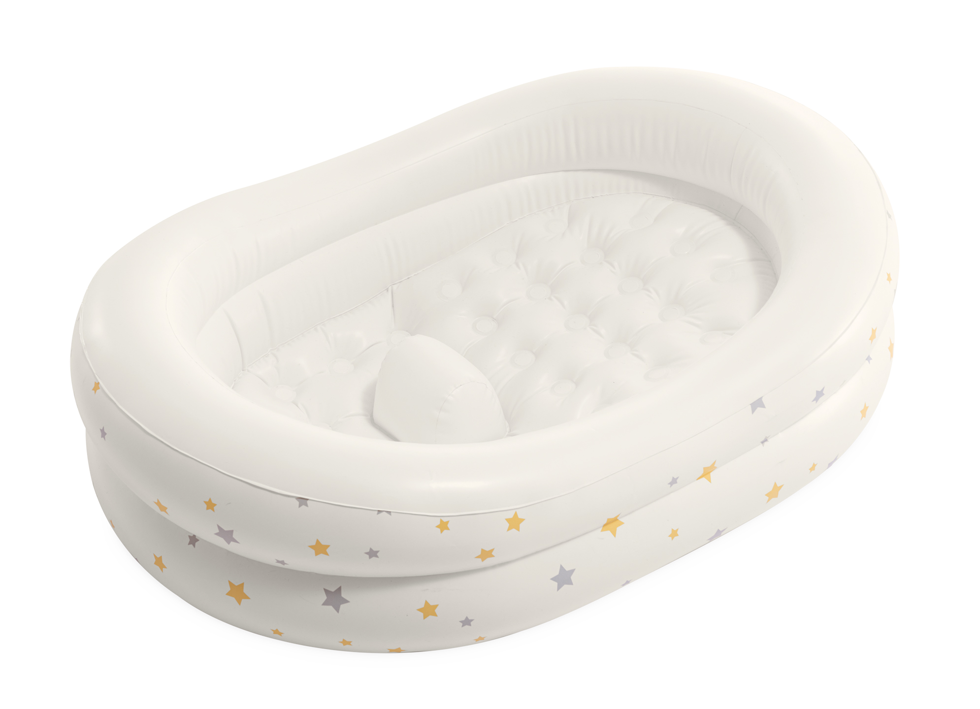 Dětská nafukovací vanička s potiskem hvězdiček. Lehká a snadno přenosná s měkkým a pohodlným povrchem pro šetrné koupání. Podpůrný výstupek pomáhá zabránit sklouznutí miminka. Balení obsahuje ruční pumpu.