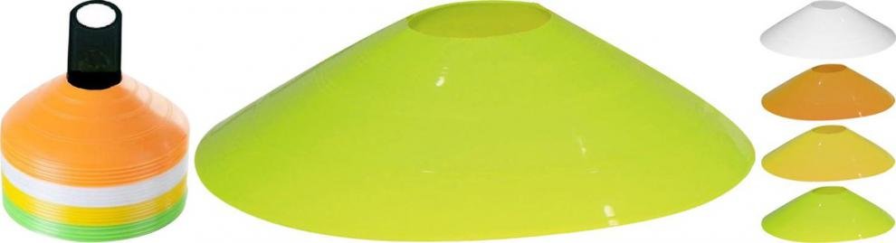 Jsou výrazně barevné kužely vyrobené z PP materiálu. Kvalitna základna o Ø20 cm. Určené pro označení terénu při na klubových trénincích na každém povrchu. Oka na špici modelu jsou určené pro uchycení gymnastických tyčí a vytváření mini překážek. Tato pomůcka je nezbytná pro každý venkovní nebo halový trénink.