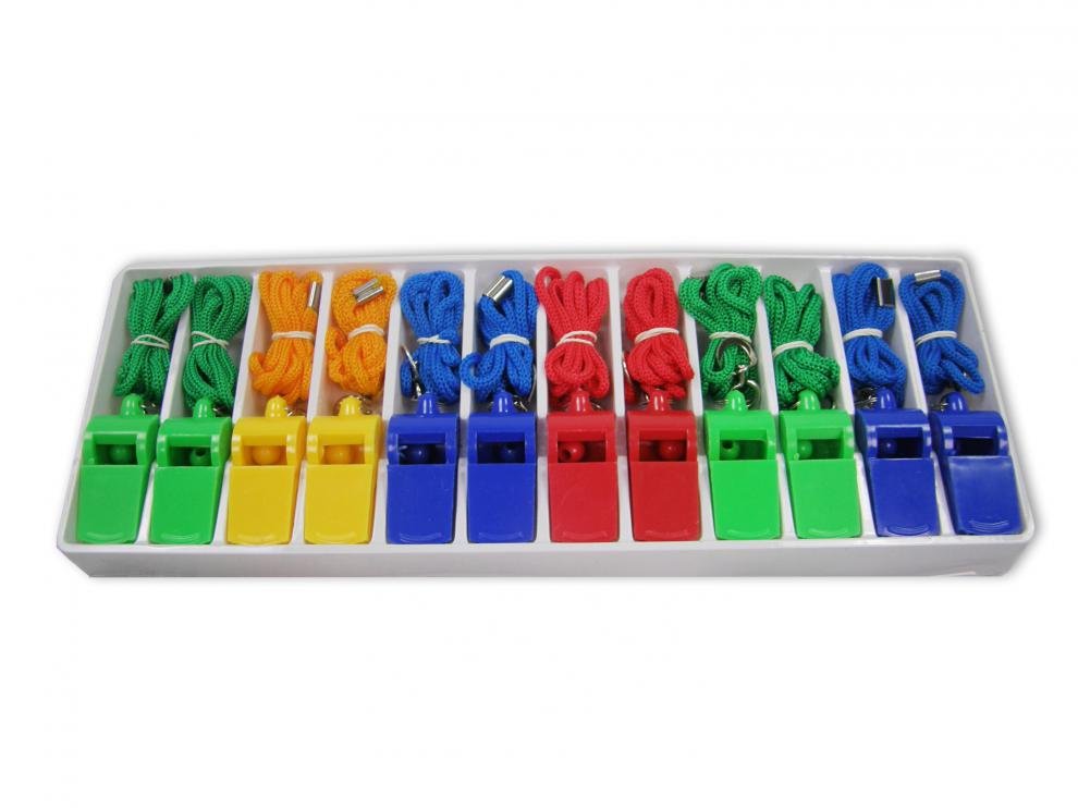 Hlasité plastové píšťalky v sadě po 12ti kusech. Součástí sady je také šňůrka pro každou znich. Sada má barvy píšťalek namixované.