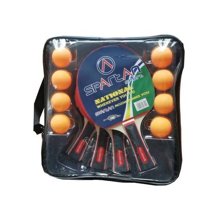 Tréninkový set na stolní tenis SPARTAN Training obsahuje 4 rakety a 8 míčků v praktické úložné tašce.