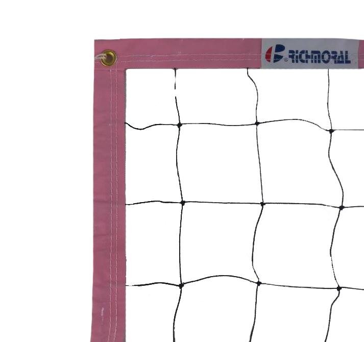Síť VOLLEYBALL beach se šňůrou : Volejbalová síť pro plážový volejbal. Uzlová síťovina černá z polypropylenu 2 mm, oko 10 cm. Horní okraj je oblemován polypropylenovým růžovým popruhem, hotová šíře lemování 5cm. V popruhu je protažena polypropylenová šňura 5mm. Boky jsou lemovány PP růžovým popruhem, hotová šíře lemování 5cm. Spodní okraj je také lemován a obšitý.