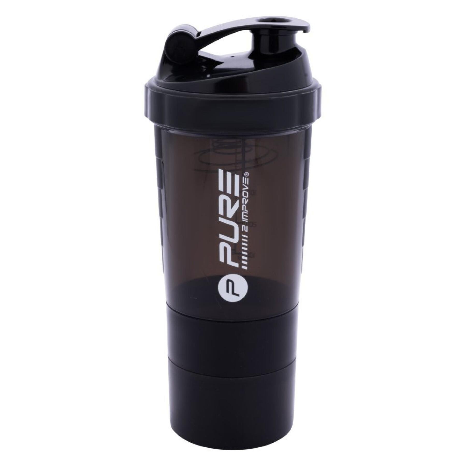 Vícedílný šejkr o objemu 500 ml, který je složen z několika dílů. S tímto šejkrem Pure2improve už nebudete muset nosit své celé své doplňky a suplementy do posilovny. Šejkr o objemu 500 ml má 2 přidělatelné přihrádky pro vaše doplňky. Potěší Vás i víko se speciální úpravou proti výtoku tekutin.