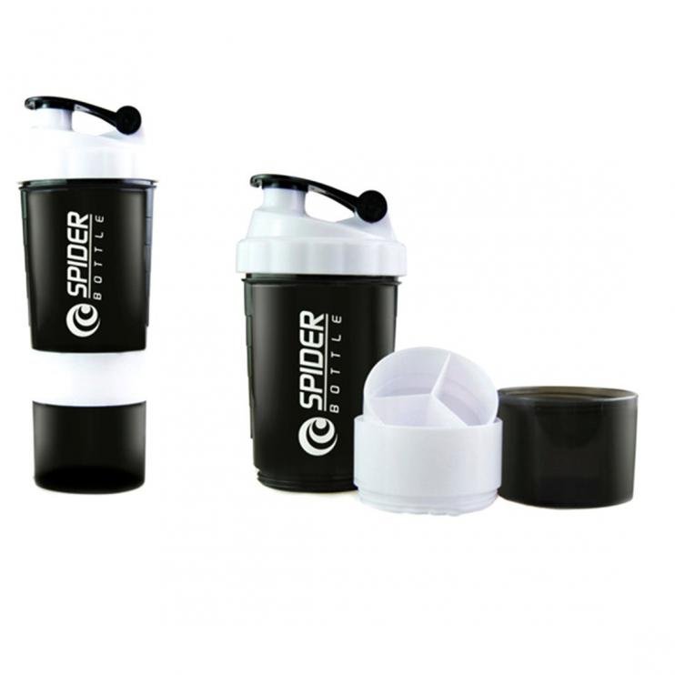 Je vícedílný šejkr o objemu 700 ml, který sestává ze tří dílů. První díl je určen pro míchání práškových doplňků výživy nebo tekutin, druhý poslouží na tablety a kapsle, a třetí na práškové suplementy. Šejkr obsahuje klasický závit a spirálu na dokonalé rozmíchávání vašich oblíbených proteinů, aminokyselin, předtréninkových stimulantů a kreatinu. Třídílný šejkr Spider Bottle je dostupný hned v několika barevných kombinacích, ze kterých si určitě vyberete tu svou oblíbenou.